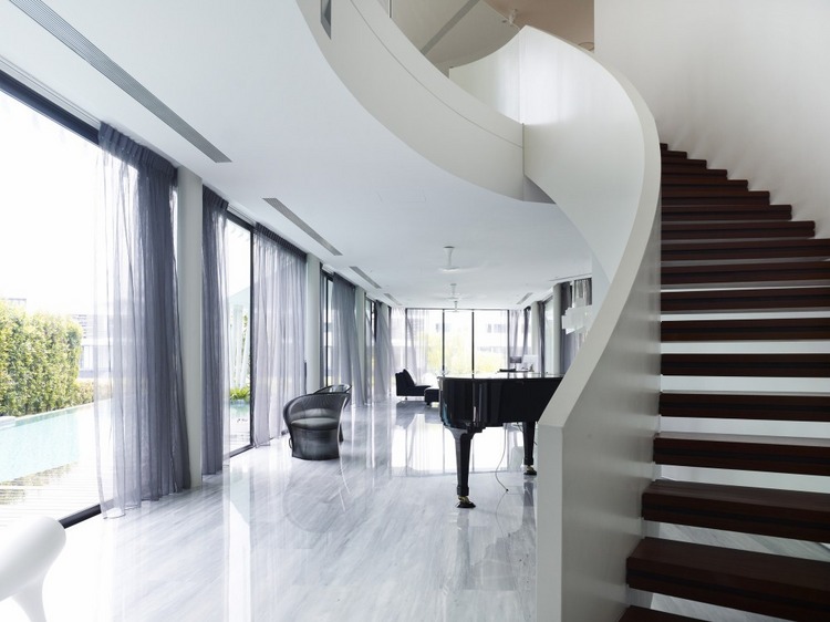 別墅設計,13 Cove Grove別墅(13 Cove Grove)13 Cove Grove別墅建在一處狹長的基地上,正對著一小片水域。為了使居住者最大化地欣賞到水域的風景,設計團隊將別墅裝修設計成一個類似回力鏢的體量,從而使臥室正面像這片美景。這樣的布局安排,使這個游泳池的一邊一直延伸至一層的一側。另外,團隊還在一層的主要區域設計了一個連續性的空間,進入這里后,人們可以看到筆直的水域獲得更加連續的視野。與水域相連的是一個線性的木質甲板設計,一直從房間內部延伸出來,視覺上增加了房屋的面積。除了基本的回力鏢設計,團隊至少還采用了另外兩種布局的變體,從立面設計看,設計師以完全不同的方式設計了不同兩側的回力鏢體量。面向街角的一層,將透明與封閉設計交叉使用,而二層則完全使用了實體墻進行立面設計。靠向水域的一層則采用了相對開放的透明玻璃設計,增強了可視度。一層主要作為公共活動空間,二層為臥室區域,而與屋頂花園相連接的三層則主要作為工作室使用。