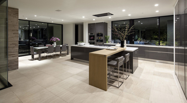 房子位于一條街道,為了減少汽車噪音影響,建筑師用高大的圍墻和大門將庭院與街道隔開,大門兩側(cè)是玻璃百葉,起到緩沖噪音的作用,同時不阻擋光線通過。此外,還設(shè)計了一條路和小橋,將大門和室內(nèi)連接。穿過院子時,可以欣賞水景,也能聽到瀑布墻的流水聲,使人感到非常放松。
